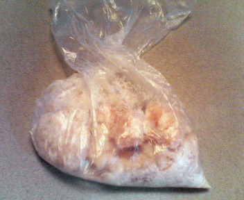 2.10分くらいしたら、ビニール袋に衣用の粉を入れ、鶏肉をビニール袋に入れる。