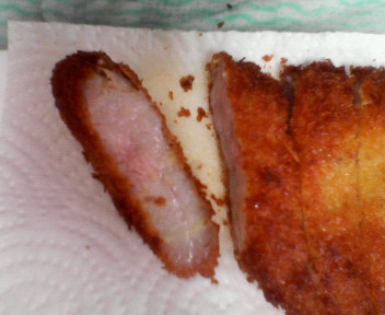 このくらいにちょっとピンクになるのがベストな揚げ加減(カツの切り口をくっつけておけば、余熱で完全に火がとおります。めっちゃジューシー)