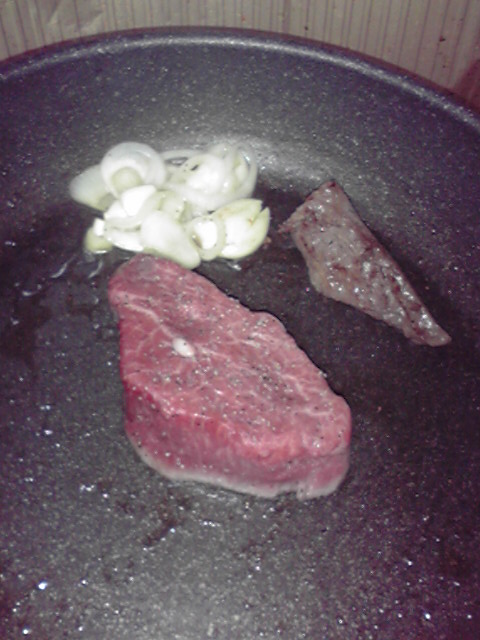 4.牛肉に塩こしょうをし、強火にしたフライパンに投入。玉ねぎも投入。
